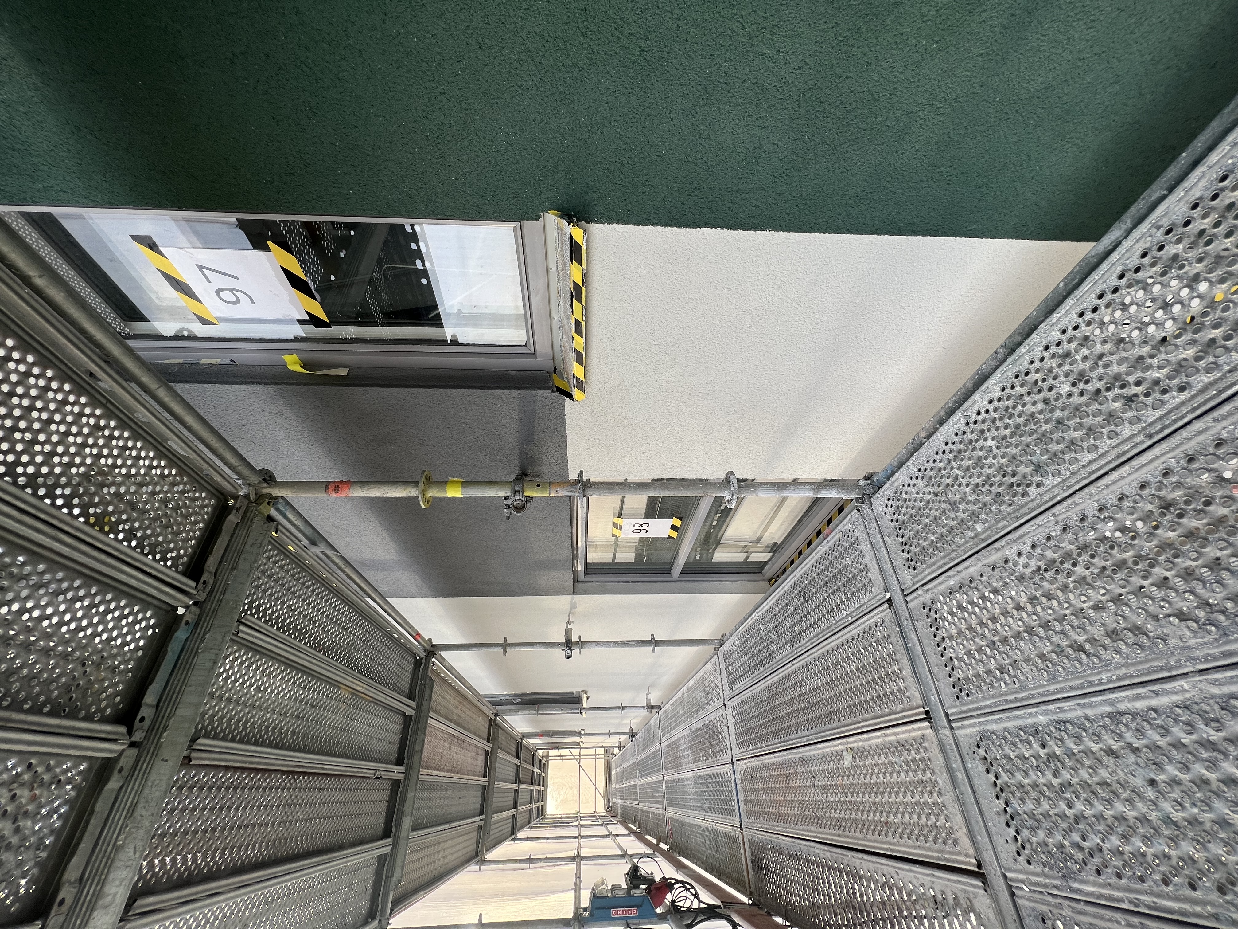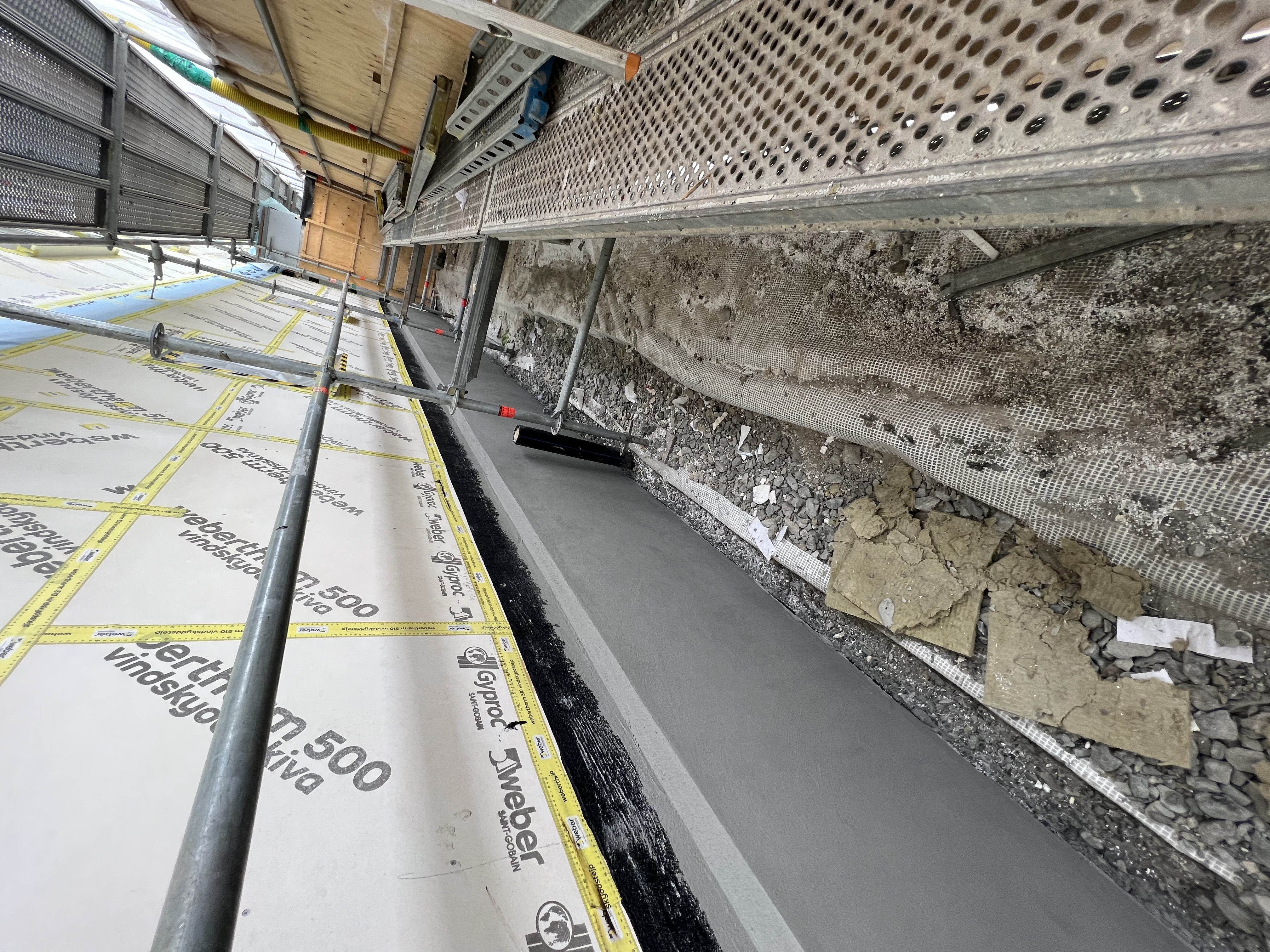 Som sista puskikt har man tillämpat Webermin 208 Rivputs Fin, som är en genomfärgad rivputs med glimmereffekt. Ytan skrapas därefter med spikbräda.